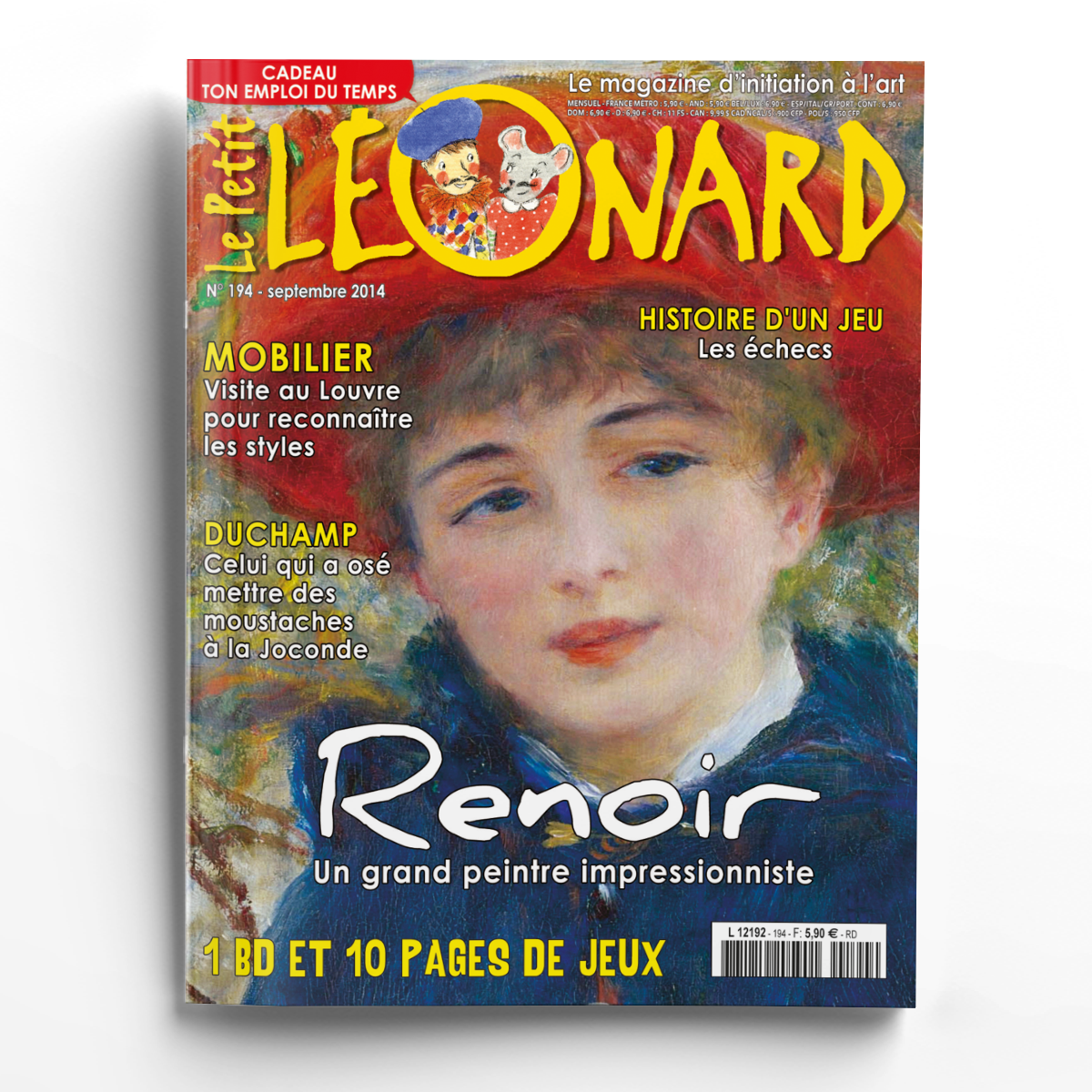 Bonjour et bonne rentrée ! J’espère que tu as passé de bonnes vacances ! J'ai profité de ces mois d’été pour te préparer un numéro haut en couleur, et faire une nouvelle maquette de ton Petit Léonard. Le peintre Auguste Renoir en est la vedette : il adorait peindre les enfants et sa famille avec des couleurs douces et pastel. Joconde est très fière, car elle a obtenu une entrevue exclusive avec la Joconde moustachue de Marcel Duchamp : elle (la Joconde moustachue) lui a tout raconté sur ce grand agitateur de l’art du 20e siècle. Un entretien décoiffant et passionnant ! Et tous les deux, nous sommes allés visiter les nouvelles salles du département des objets d'art au Louvre pour en savoir plus sur l'histoire des styles... Joconde a eu très peur devant une pendule rhinocéros et a failli grignoter le pied d'une commode, car les émotions lui donnent faim ! Bonne découverte et bonne lecture... et n’hésite pas à nous envoyer tes commentaires ou suggestions !