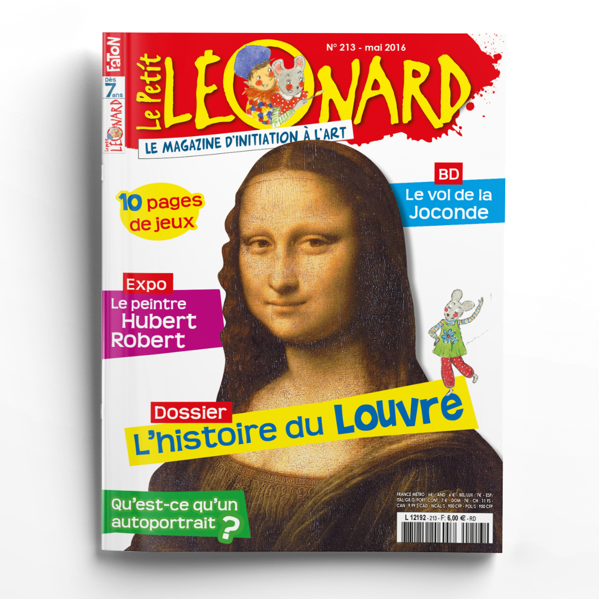 Connais-tu Hubert Robert, le peintre des ruines ? Nous sommes allés l’interviewer au Louvre sur sa vie riche d’aventures ! Je l’envie beaucoup depuis qu’il nous a raconté qu’il avait logé au Louvre. Quelle chance ! Nous avons alors voulu en savoir un peu plus sur l’histoire du gigantesque palais des rois devenu l’un des plus beaux musées du monde. Et nous avons découvert l’incroyable histoire du vol de la Joconde. Le tableau, bien sûr, pas Joconde (la souris) ! D’ailleurs Joconde (la souris) a eu tellement peur qu’on le vole à nouveau, qu’elle a foncé au Louvre pour faire un selfie devant le chef-d’œuvre de Léonard de Vinci ! Et elle a ajouté, j’ai un aussi beau sourire que Mona Lisa ! Ah, cette Joconde ! Léonard (et Joconde !)