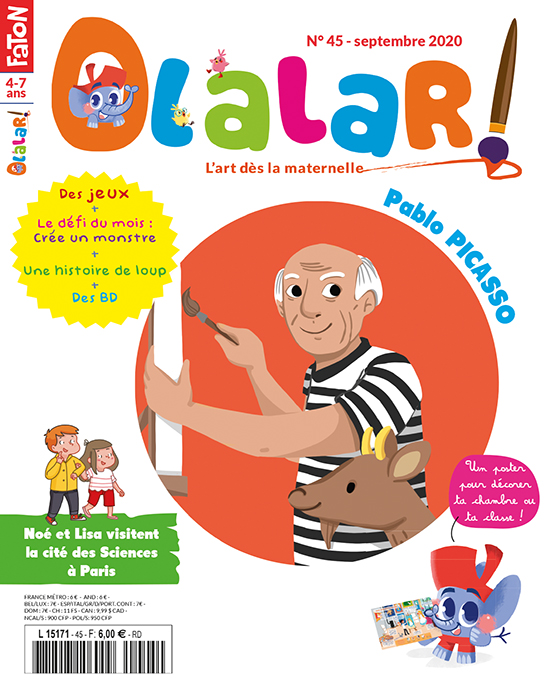 C’est la rentrée ! Avec mes amis Croki et Gomme, deux poussins malicieux, nous allons découvrir un grand artiste qui voulait dessiner comme les enfants : Pablo Picasso ! Nous partirons ensuite avec Noé et Lisa visiter la cité des Sciences et de l’Industrie. Dans ce numéro, il y a aussi des jeux pour apprendre à mieux regarder les œuvres d’art, une histoire, un concours de dessin, un poster à détacher… Oh là l’art quel joli programme !