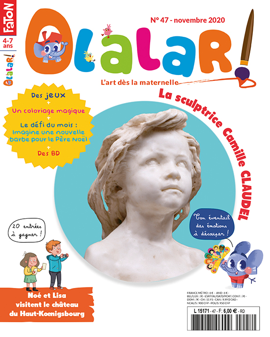 Ce mois-ci, avec mes amis Croki et Gomme, nous vous proposons de découvrir les œuvres d’une grande sculptrice : Camille Claudel. Avec Noé et Lisa, vous allez visiter le château du Haut-Kœnigsbourg en Alsace et tenter de gagner des entrées gratuites. D’autres surprises vous attendent : des jeux, une histoire qu’Olalar adore, un défi à relever, un coloriage magique… Bonne lecture et amusez-vous !