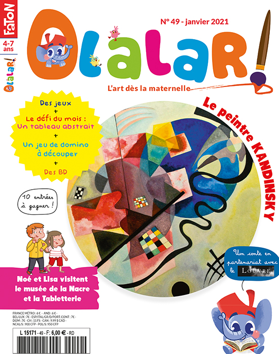 Dans ce premier numéro de l’année, place aux taches de couleur, aux lignes et aux formes ! C’est ce qu’a choisi de représenter le peintre Kandinsky et que nous te faisons découvrir. Ensuite, nous partirons avec Noé et Lisa visiter le musée de la Nacre et de la Tabletterie, nous apprendrons à dessiner des cercles et à peindre avec des glaçons, écouterons une histoire merveilleuse de roi et jouerons aux dominos. Ouvre vite ton numéro !