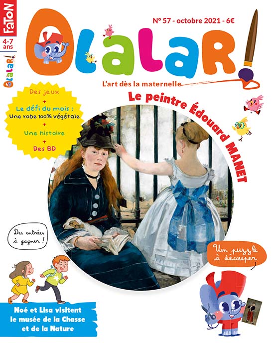 Croquer ses amis et aussi des fruits et des légumes avec ses pinceaux, c’est ce que faisait à merveille Édouard Manet. Et si nous découvrions ce peintre célèbre ? Dans ce numéro, tu as aussi rendez-vous avec Noé et Lisa pour visiter le musée de la Chasse et de la Nature. Des jeux, des BD, une histoire, des astuces pour apprendre à mieux regarder les œuvres d’art : quel beau programme !