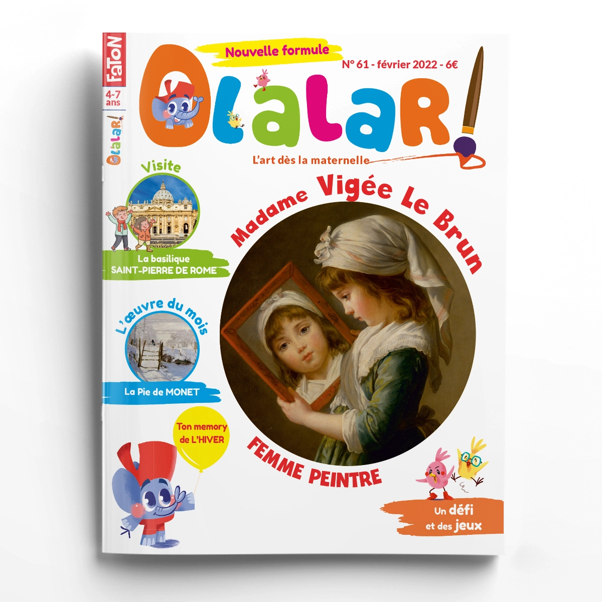 Ce mois-ci, Olalar s’est déguisé en prince pour remonter le temps et aller à la rencontre d’une grande portraitiste, Élisabeth Vigée Le Brun. Ensuite, direction Rome, pour une visite de l’immense basilique Saint-Pierre avec Noé et Lisa. Nous mettrons notre bonnet et regarderons de plus près un joli paysage enneigé de Monet, ouvrirons grand nos yeux pour découvrir ce qui se cache derrière le détail mystère et nos oreilles avec une histoire passionnante d’éléphant. Amuse-toi bien !