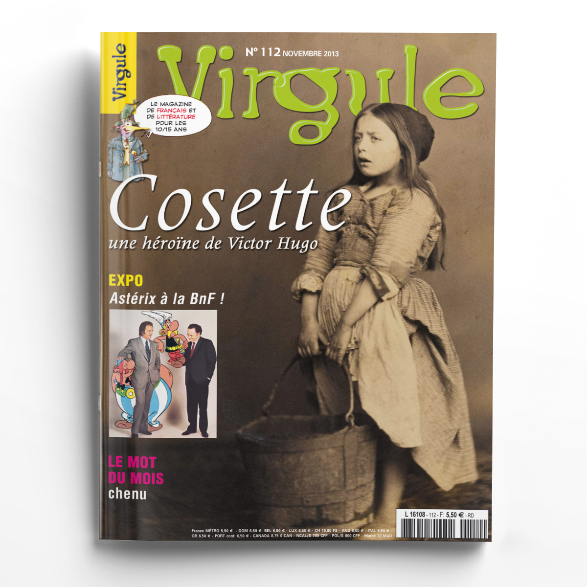 Ce mois-ci, Virgule te propose de découvrir Cosette, une héroïne de Victor Hugo (1802-1885). Cet écrivain a mené une lutte incessante contre les injustices de son temps et contre la misère. En 1862, il publie les Misérables, énorme ouvrage dans lequel la petite et émouvante Cosette, est le symbole de l’enfance bafouée et martyrisée. Ali et Lola sont allés voir Astérix à la BnF !, une superbe exposition qui rend hommage à Astérix et à ses pères, le scénariste René Goscinny et le dessinateur Albert Uderzo. Dans ce numéro, l'actualité est très riche avec le centenaire de la naissance d'Albert Camus, Roald Dahl réédité, une exposition de somptueux manuscrits enluminés, une autre de livres animés et des salons du livre. Tu trouveras aussi le coin lecture, le courrier et les poèmes des lecteurs, la SPM et l'étymolojeu, sans oublier la BD d'Ali et Lola !