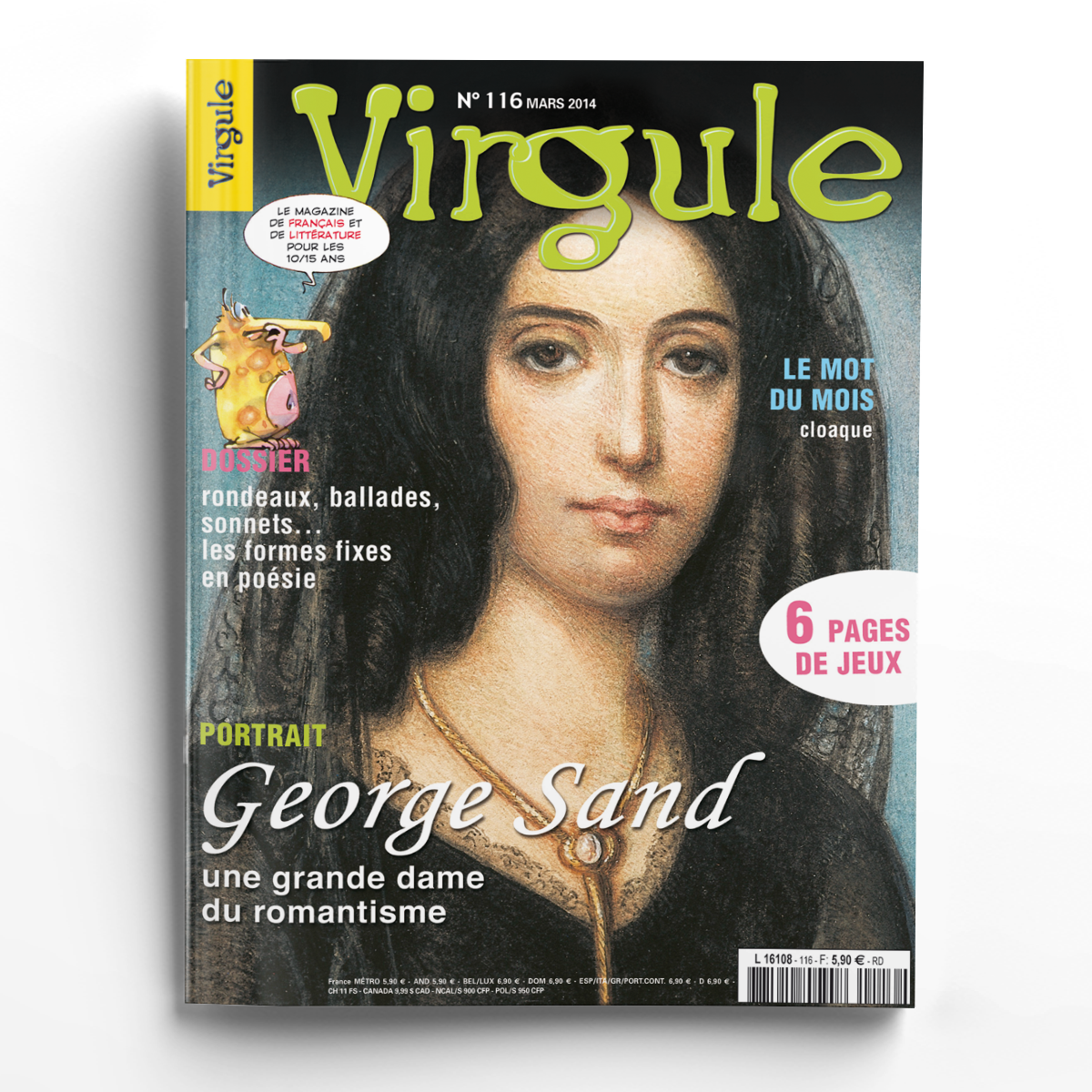 Virgule te présente ce mois-ci George Sand, une grande dame du romantisme. Elle est, en effet, une figure exemplaire de ce mouvement dont elle a incarné les idéaux et les combats. Elle a osé s’affranchir des conventions pour mener une vie de femme libre. Courageuse et volontaire, elle s’est battue, à une époque où les lois imposaient aux femmes d’être sous l’entière dépendance des hommes, pour l’égalité des sexes, dans la société et en littérature. Elle a lutté aussi, aux côtés du peuple et des pauvres, contre les inégalités et les injustices. Auteur prolixe, elle s’est illustrée dans le genre du roman champêtre. Avis aux poètes en herbe ! Virgule te propose des explications, exemples à l'appui, sur les formes fixes en poésie : rondeaux, ballades, sonnets... Cet article est un véritable atelier de versification ! Retrouve aussi le coin lecture, le courrier et les poèmes des lecteurs, la SPM et l'étymolojeu, sans oublier la BD d'Ali et Lola !