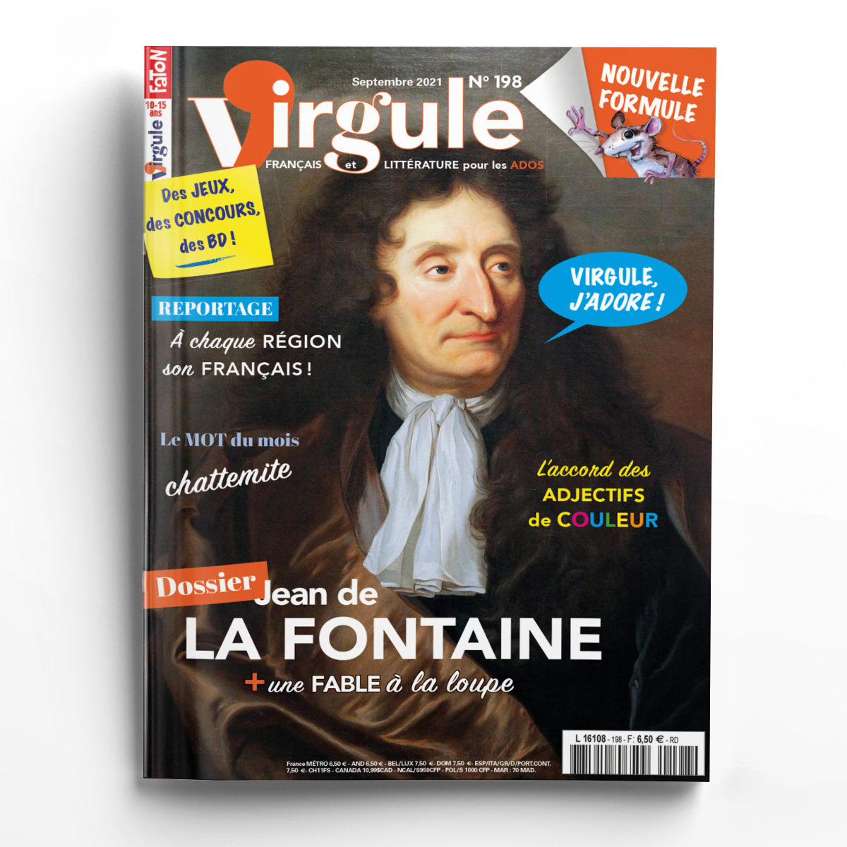 En cette rentrée, Virgule vous propose sa nouvelle formule ! Jean de La Fontaine et ses fables sont à l’honneur dans un grand dossier. Un reportage vous apprend que selon les régions, les mots pour désigner une même chose changent. De nouvelles rubriques vous attendent : Passerelle, qui fait le lien entre la littérature et les autres arts, Des figures « tropes » stylées ! (ce mois-ci, l’hyperbole) et Objectif zéro faute (Comment accorder les adjectifs de couleur ?). Au sommaire de ce numéro également : La Cuisine des écrivains – la madeleine de Proust –, un mot à adopter avec la SPMchattemite –, le café littéraire, le courrier, les actus et les BD ! Participez à nos concours pour gagner des livres ! Bonne rentrée !