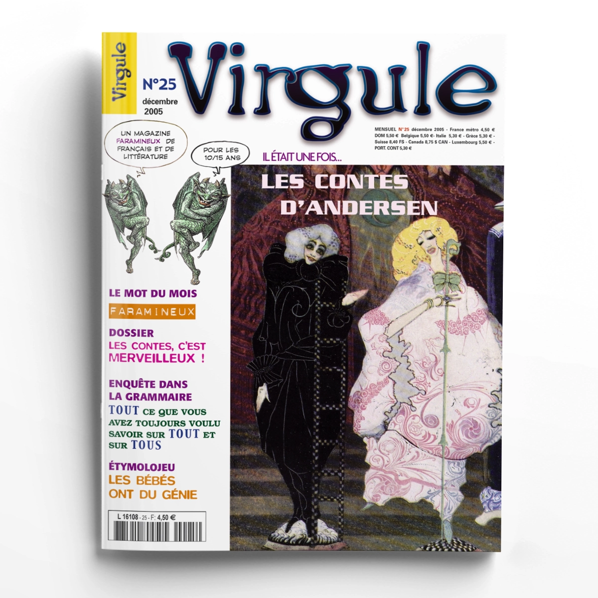 Pour son numéro de décembre, Virgule vous présente des contes d’Andersen, auteur danois de nombreux contes (la Petite Fille aux allumettes, la Princesse sur le petit pois...). Au sommaire de ce numéro également : un mot à adopter avec la SPM (faramineux), uneenquête sur la grammaire, un Étymolojeu, les nouvelles, le courrier, ainsi que les BD. Et deux fiches en cadeau.