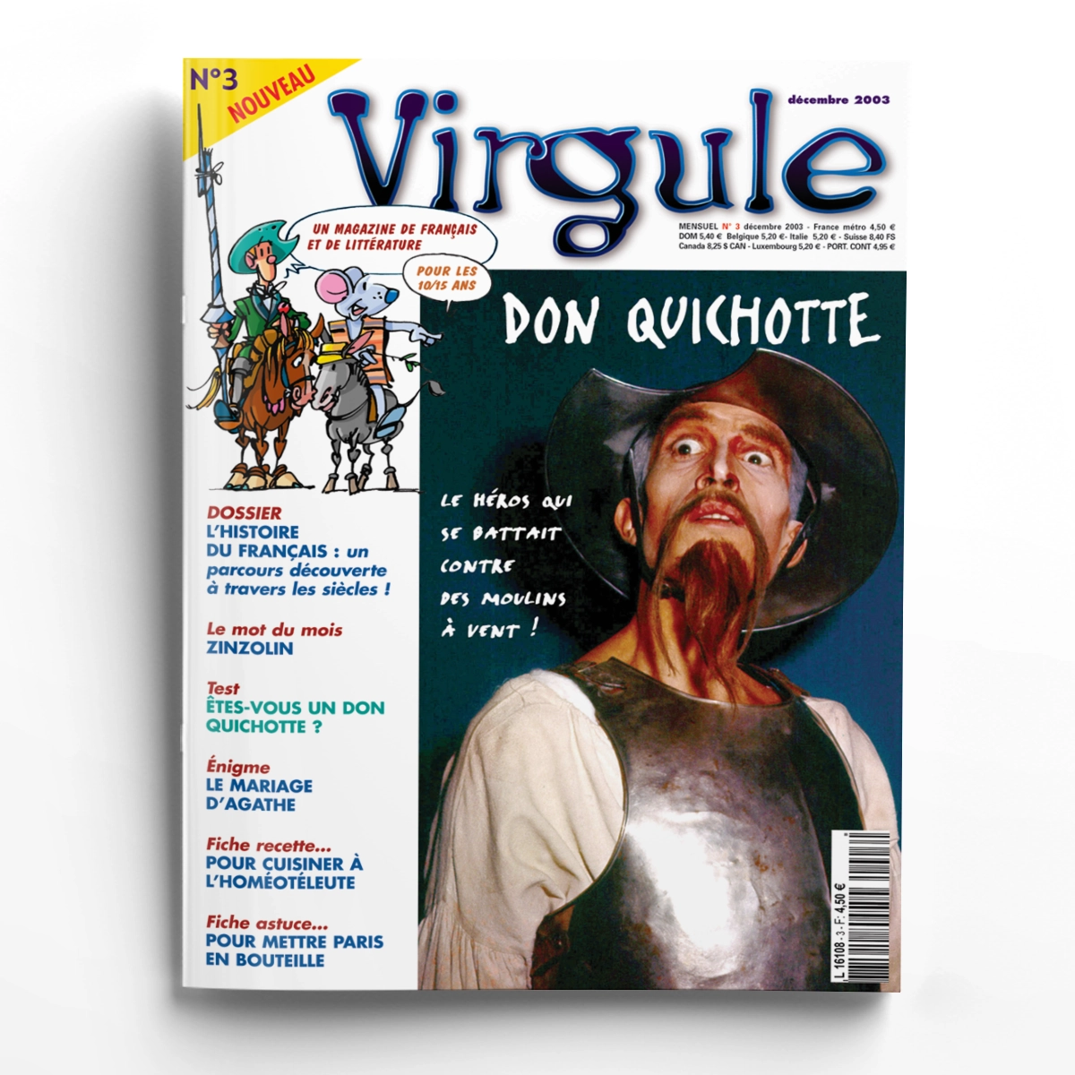En décembre, Virgule vous propose un grand dossier sur Don Quichotte, le héros qui se battait contre les moulins à vent. Au sommaire de ce numéro également : un dossier sur l’histoire du français ; deux fiches sur l’homéotéleute et sur l’usage de « si » ; un mot à adopter avec la SPM (zinzolin) ; et puis le courrier, les nouvelles, les jeux et les BD (Ubu Roi et Ali et Lola) !