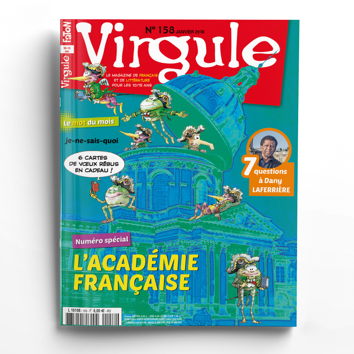 Bonne année 2018 ! En janvier, Virgule consacre un numéro spécial à l'Académie française : ses origines, son histoire, sa mission, son organisation, son célèbre Dictionnaire… Et une interview, par Ali et Lola, d’un des immortels (c’est ainsi qu’on surnomme les académiciens) : Dany Laferrière. Au sommaire de ce numéro également : un mot à adopter avec la SPM – je-ne-sais-quoi –, le courrier, le coin lecture, les jeux et les BD ! + 6 cartes de vœux rébus en cadeau !