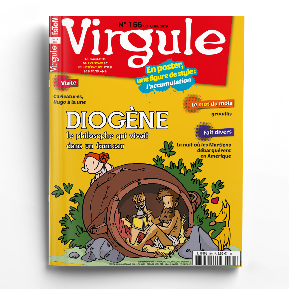 Pour son numéro d'octobre, Virgule vous propose un grand dossier sur Diogène, le philosophe qui vivait dans un tonneau. Diogène, surnommé Diogène le chien, est sans doute le plus original et le plus anticonformiste des philosophes de la Grèce antique. Il est certainement aussi celui qui a le plus marqué les esprits de ses contemporains, non seulement par sa conduite, jugée scandaleuse ou folle par certains, et exemplaire par d’autres, mais aussi par son humour, son ironie (aussi mordante que les crocs d’un chien), son sens de la répartie. Au sommaire de ce numéro également : Caricatures, Hugo à la une, une exposition à la Maison de Victor Hugo ; un Fait divers étonnant (le jour où les Martiens ont débarqué en Amérique) ; un mot à adopter avec la SPM (grouillis) ; et puis le coin lecture, les jeux et les BD ! Bonus ! En poster, une figure de style : l'accumulation.