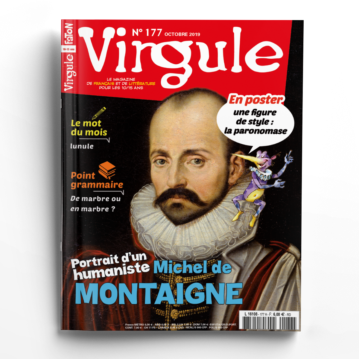 En octobre, Virgule vous propose un portrait de Michel de Montaigne, un écrivain et penseur humaniste du XVIe siècle. Pour essayer de comprendre l’être humain, il s’est étudié lui-même. Au fil des années, il a recueilli les fruits de cet original travail d’analyse dans un vaste ouvrage qu’il a modestement intitulé les Essais, et qui renferme de précieuses, et souvent joyeuses, leçons de sagesse. Au sommaire de ce numéro également : un mot à adopter avec la SPMlunule –, un Point grammaire (De marbre ou en marbre ? Il y a matière à réflexion !), le coin lecture, les jeux et les BD ! Et, en poster, une figure de style : la paronomase.