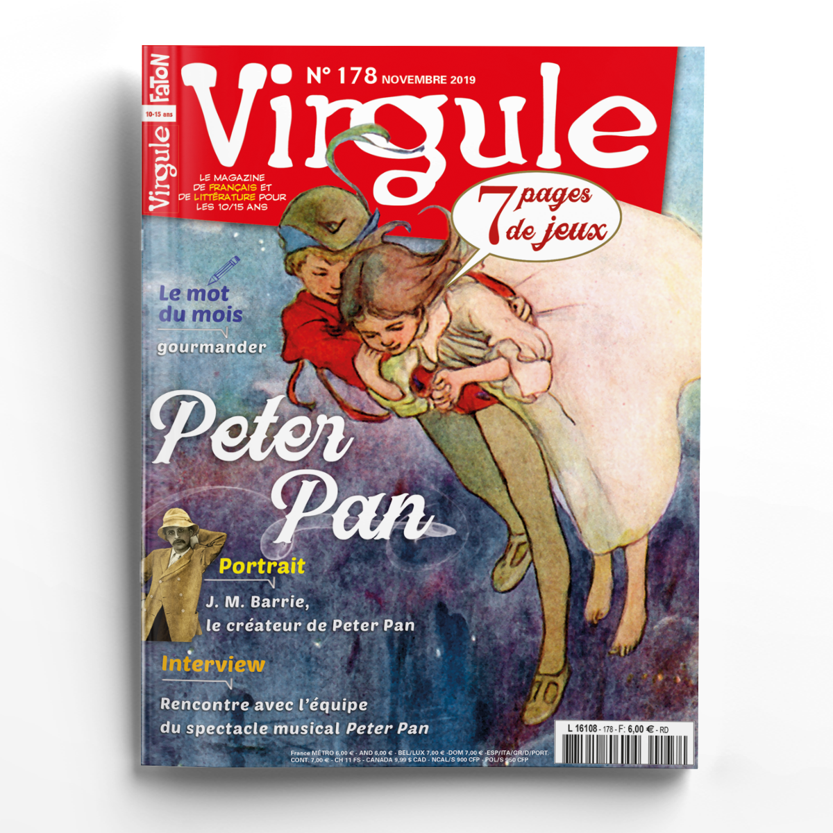 En novembre, Virgule vous propose un numéro spécial Peter Pan, avec un portrait de James Matthew Barrie – le créateur de Peter Pan –, un dossier sur Peter Pan, le garçon qui ne voulait pas grandir, une rencontre autour du spectacle Peter Pan, avec un concours pour gagner des places, et un Fait divers (grâce à la poussière de fée, l’écrivain J. M. Barrie met fin à une épidémie de chute d’enfants). Au sommaire de ce numéro également : un mot à adopter avec la SPMgourmander –, le coin lecture, le courrier, les jeux et les BD !