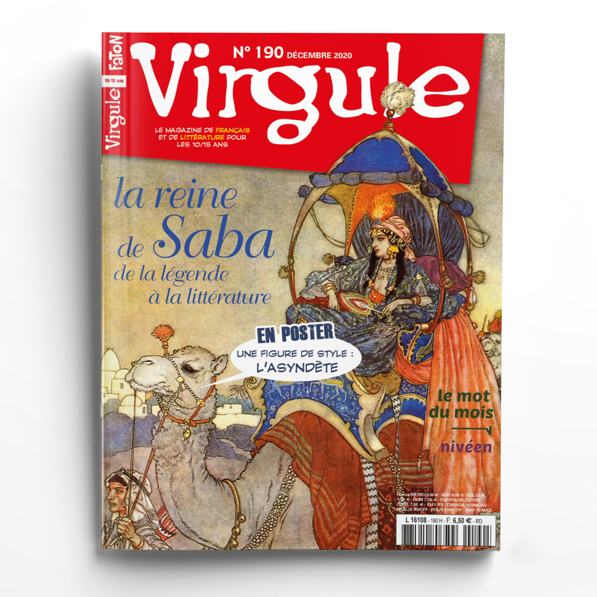 Pour son dernier numéro de l'année, Virgule vous propose un grand dossier consacré à une reine légendaire : la reine de Saba. Au sommaire de ce numéro également : un Fait divers (Drôles d’animaux de compagnie !), un mot à adopter avec la SPM – nivéen –, le coin lecture, le courrier, les jeux et les BD ! Et, en poster, une figure de style : l’asyndète. Joyeux Noël !