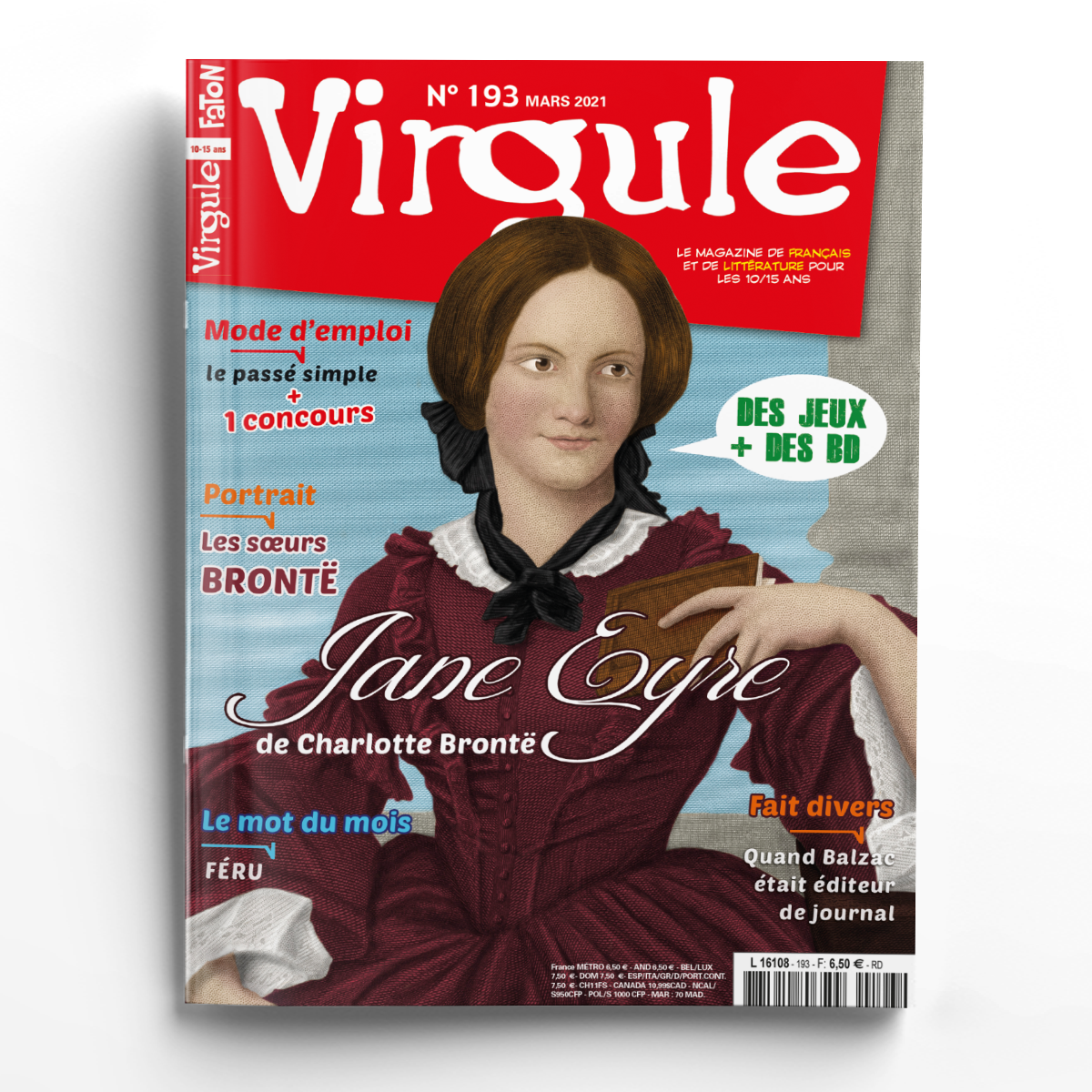 En mars, Virgule vous propose un grand dossier sur Jane Eyre, un célèbre roman de Charlotte Brontë. Une biographie complète le dossier et vous présente les sœurs Brontë, grandes poétesses et romancières du XIXe siècle. Grâce au mode d’emploi, le passé simple n’aura plus de secrets pour vous ! Au sommaire de ce numéro également : un mot à adopter avec la SPM – féru –, le coin lecture, le courrier, les actus, les jeux et les BD !