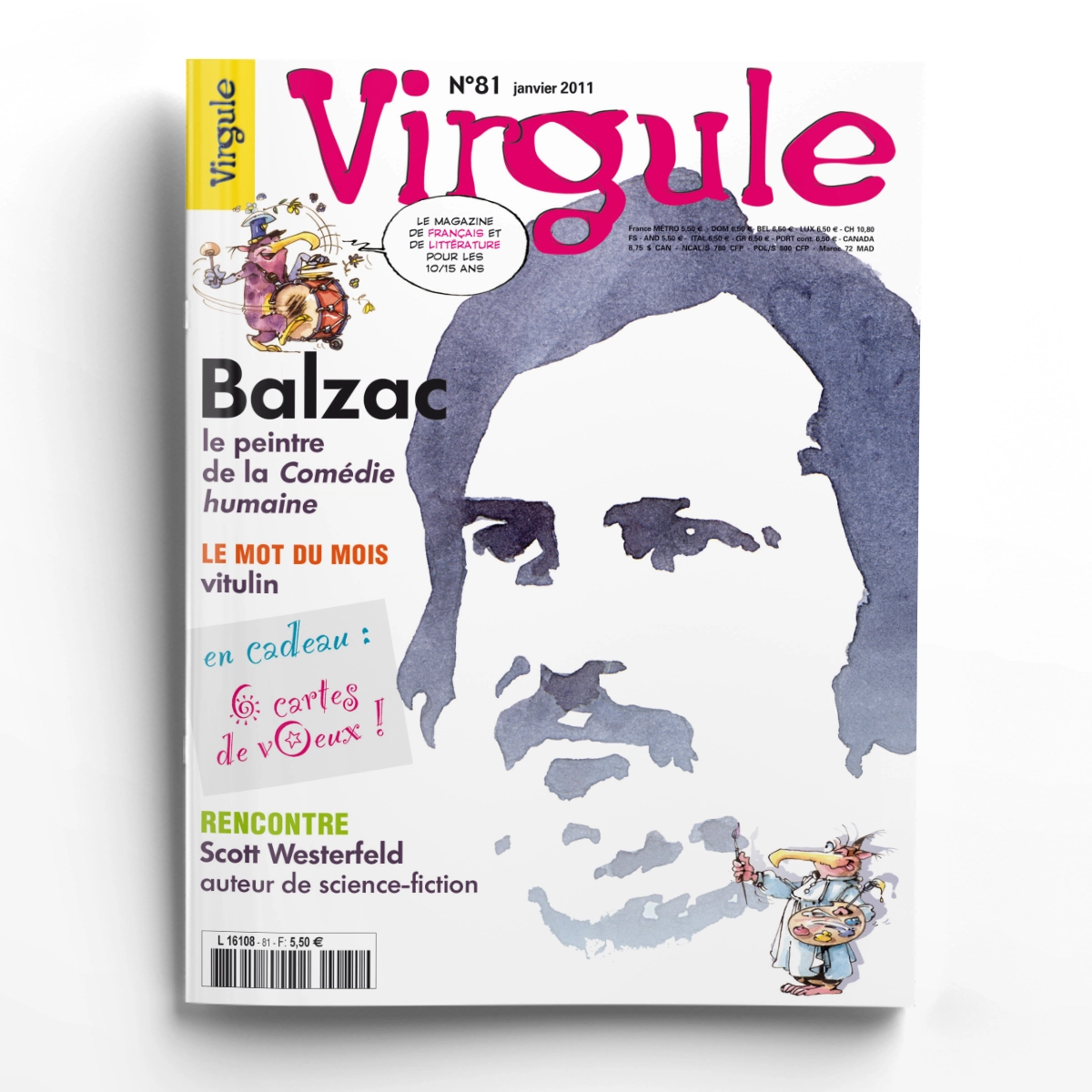 Découvrez ce mois-ci un dossier sur Honoré de Balzac. Ce portrait vous fera connaître la vie de ce romancier, auteur de la Comédie humaine. En suivant nos conseils de lecture, vous pourrez commencer à lire son œuvre foisonnante et riche. Une rencontre avec l'auteur phare de la science-fiction contemporaine, l’écrivain américain Scott Westerfeld, grâce à une interview d'Ali et Lola. Le mot du mois "vitulin" et l'histoire des mots "Et patati, et patata", vous feront jouer avec les mots. Retrouvez aussi les rimes en jeux, les nouvelles, les actus, le courrier et les poèmes des lecteurs et les jeux, sans oublier la BD d'Ali et Lola ! En cadeau, 6 cartes de vœux à découper !