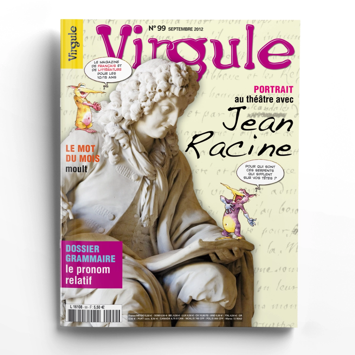 Pour la rentrée, Virgule te propose un dossier sur Jean Racine, un grand dramaturge du XVIIe siècle, avec une biographie, des résumés d'œuvre, un encadré sur la tragédie classique et un jeu de piste ! Le dossier grammaire t'emmène à Kikekoidontoù, le pays merveilleux (mais bon, tout est relatif, ici…) des pronoms relatifs ! Retrouve aussi le coin lecture, le courrier et les poèmes des lecteurs, la SPM et l'histoire des mots, sans oublier la BD d'Ali et Lola ! Dans ce numéro, découvre les quatre nouvelles planches de la BD adaptée du roman la Guerre des boutons de Louis Pergaud.